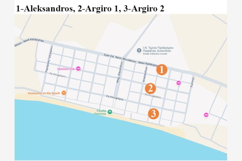 - Vila Argiro 1 se nalazi u letovalištu Dionisos, na oko 90 m od plaže. Raspolaže lepo uredjenim trokrevetnim i četvorokrevetnim dupleks apartmanima koji se nalaze na prvom spratu. Sve smeštajne jedinice poseduju kuhinju, opremljenu osnovnim kuhinjskim priborom, kupatilo i TV. Promena posteljine je jedanput u toku boravka, dok je korišćenje klima uređaja uključeno u cenu najma apartmana. U vili postoji i mogućnost korišćenja WiFi interneta.