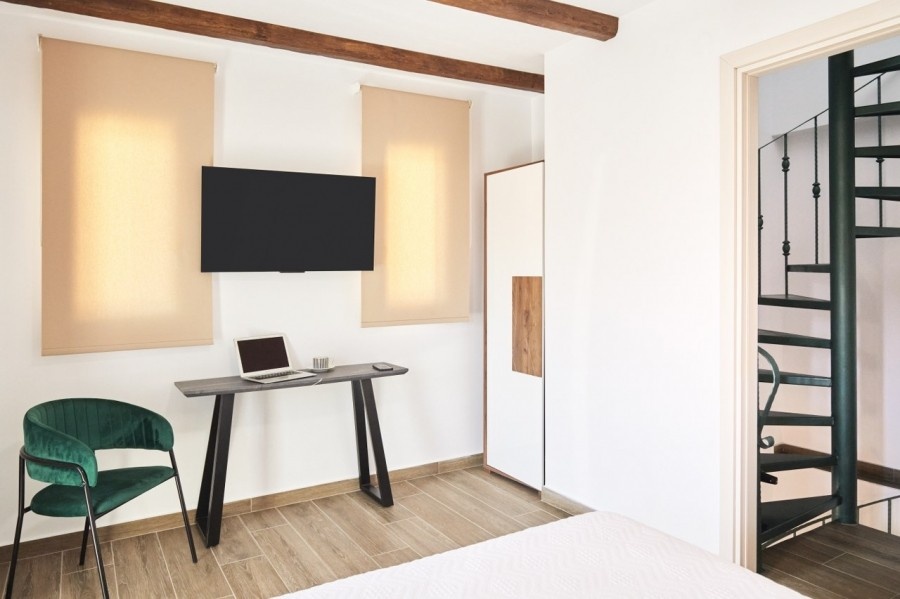 u donjem nivou se nalazi kanabe (190*160cm), kuhinja i kupatilo, klima uređaj, tv, a na gornjem nivou se nalazi bračni ležaj (200*160cm), klima uređaj, tv, toalet i terasa. - No: 2 1/4 mezoneta (nisko prizemlje / visoko prizemlje)