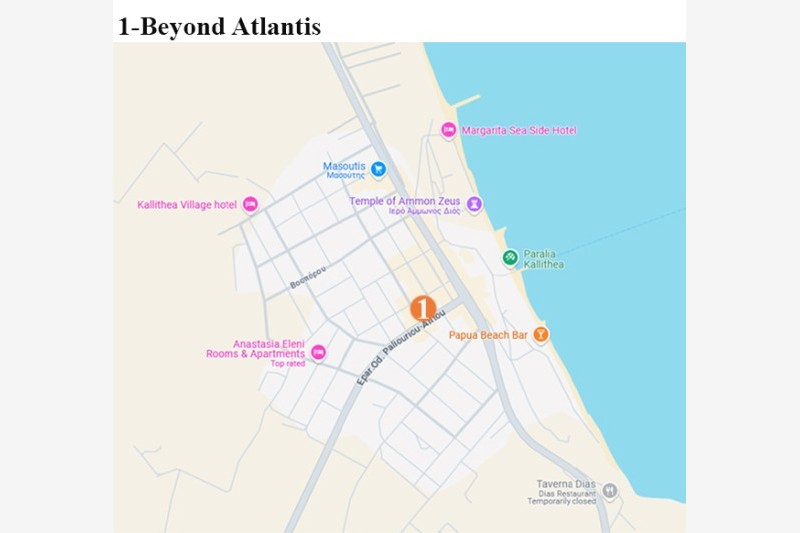 - Vila Beyond Atlantis se nalazi u centralnom delu letovališta Kalitea, u šetačkoj zoni i na oko 400 m udaljenosti od plaže. U ponudi su dvokrevetni, trokrevetni I četvorokrevetni studiji koji se nalaze u visokom prizemlju i na prvom spratu. Sve smeštajne jedinice poseduju osnovno opremljenu kuhinju, kupatilo, terasu i TV. Korišćenje klima uređaja je uključeno u cenu najma apartmana. Tokom boravka gosti sami vode računa o higijeni apartmana, dok je promena posteljine na polovini boravka. U objektu postoji i mogućnost korišćenja WiFi interneta.
