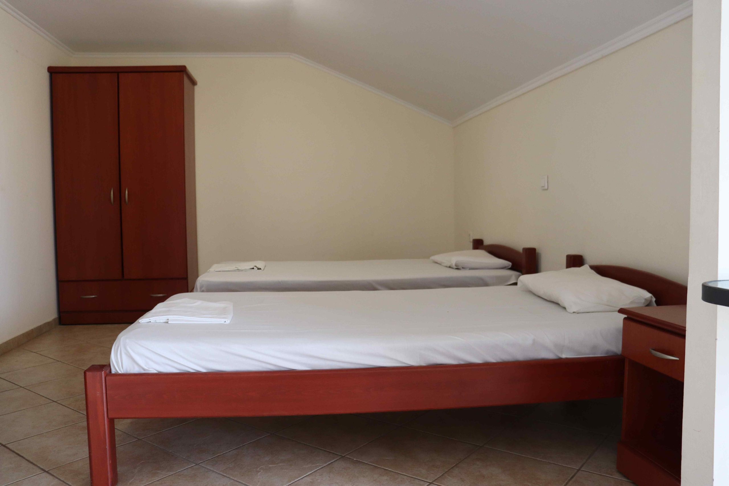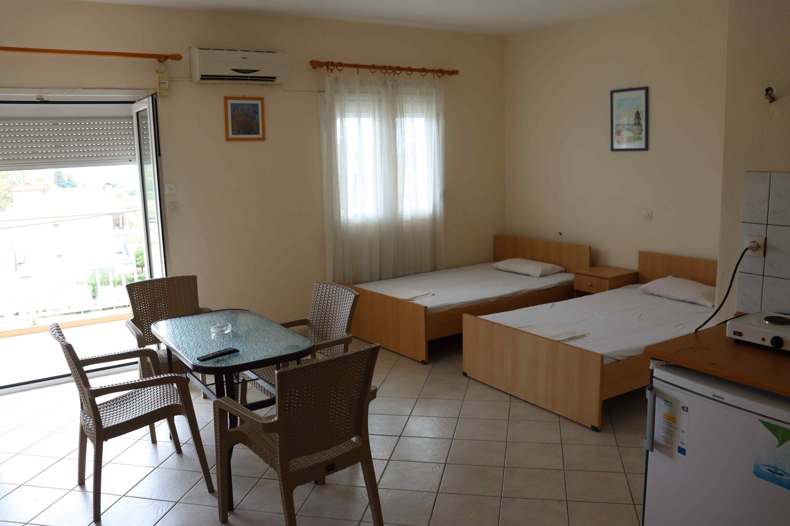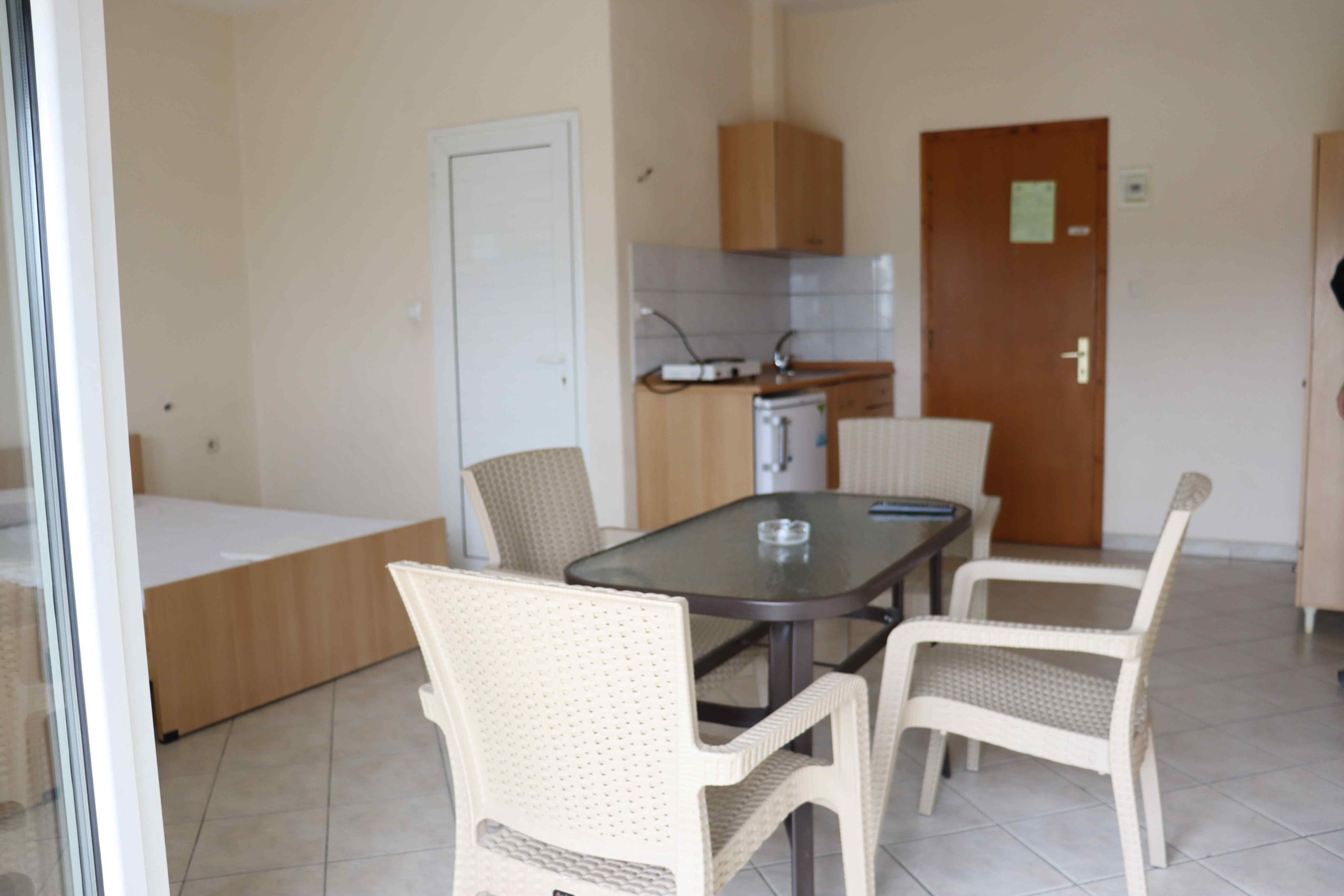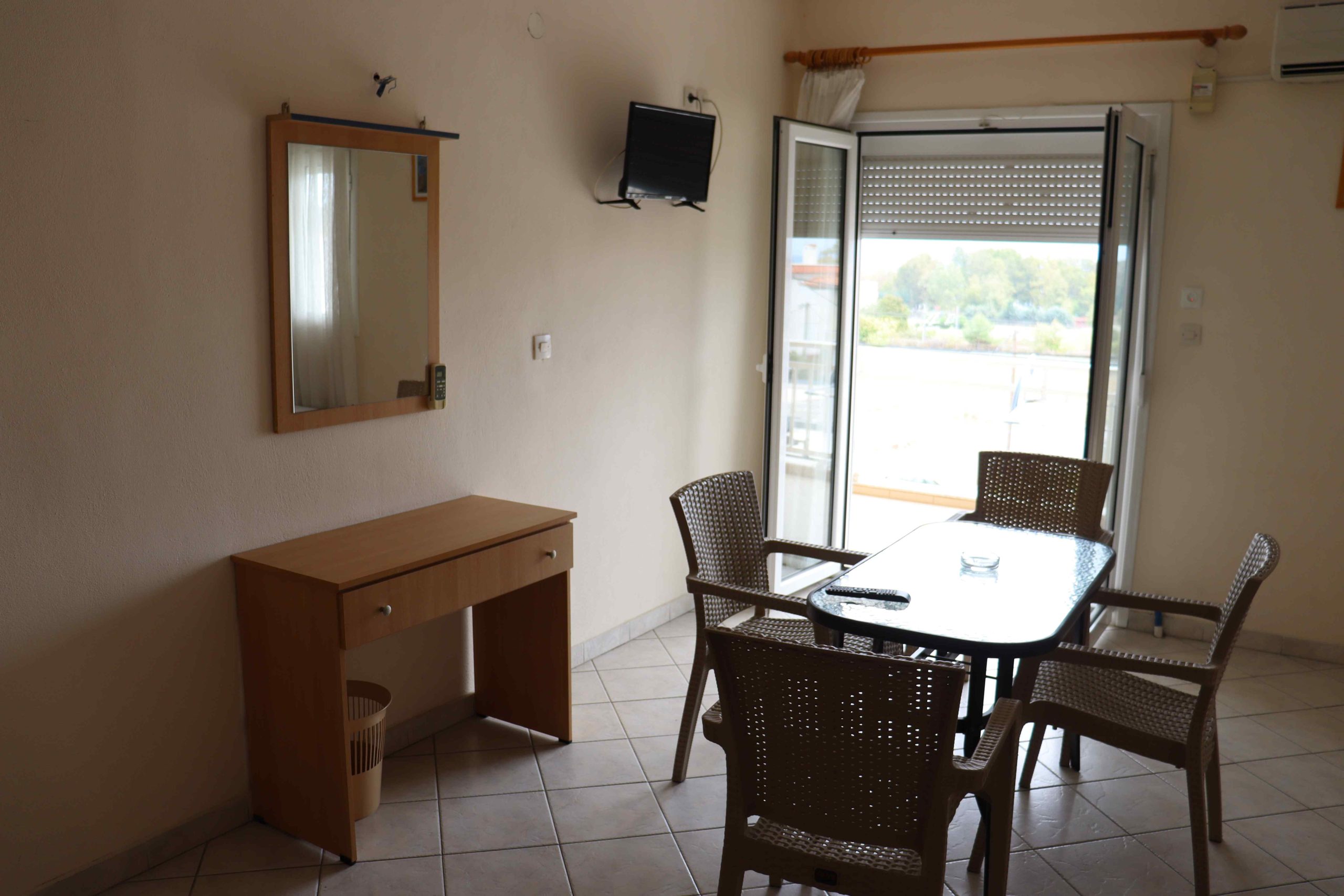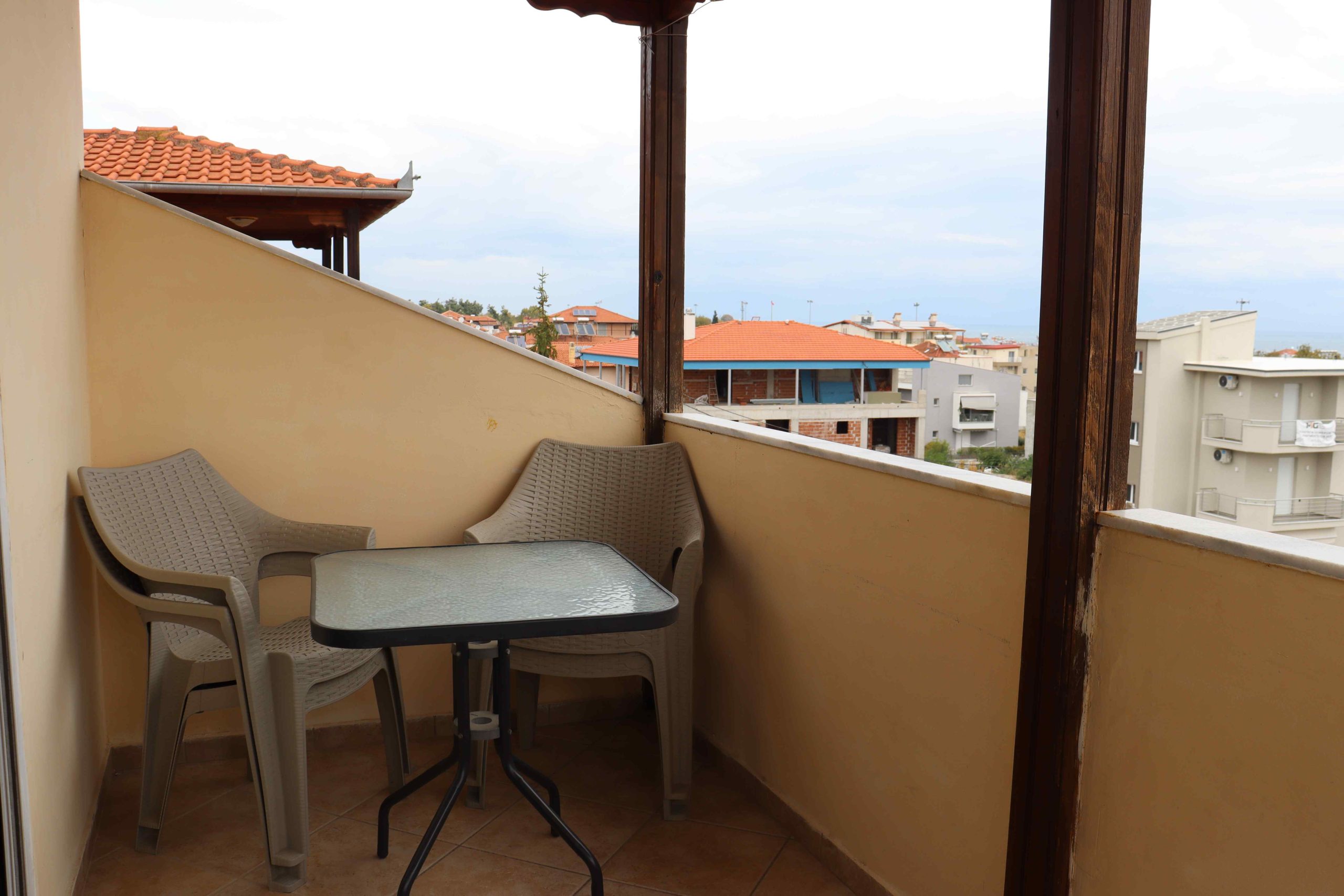 - Sadržaji: Prostrane smeštajne jedinice (25-35 m²) standardno i funkcionalno su opremljene, poseduju TV i klima uređaje. Terase na uličnoj strani pružaju pogled ka solunskom zalivu, dok su one na zapadnoj strani orijentisane prema Olimpu i imaju tende . U objektu nema peškira.
