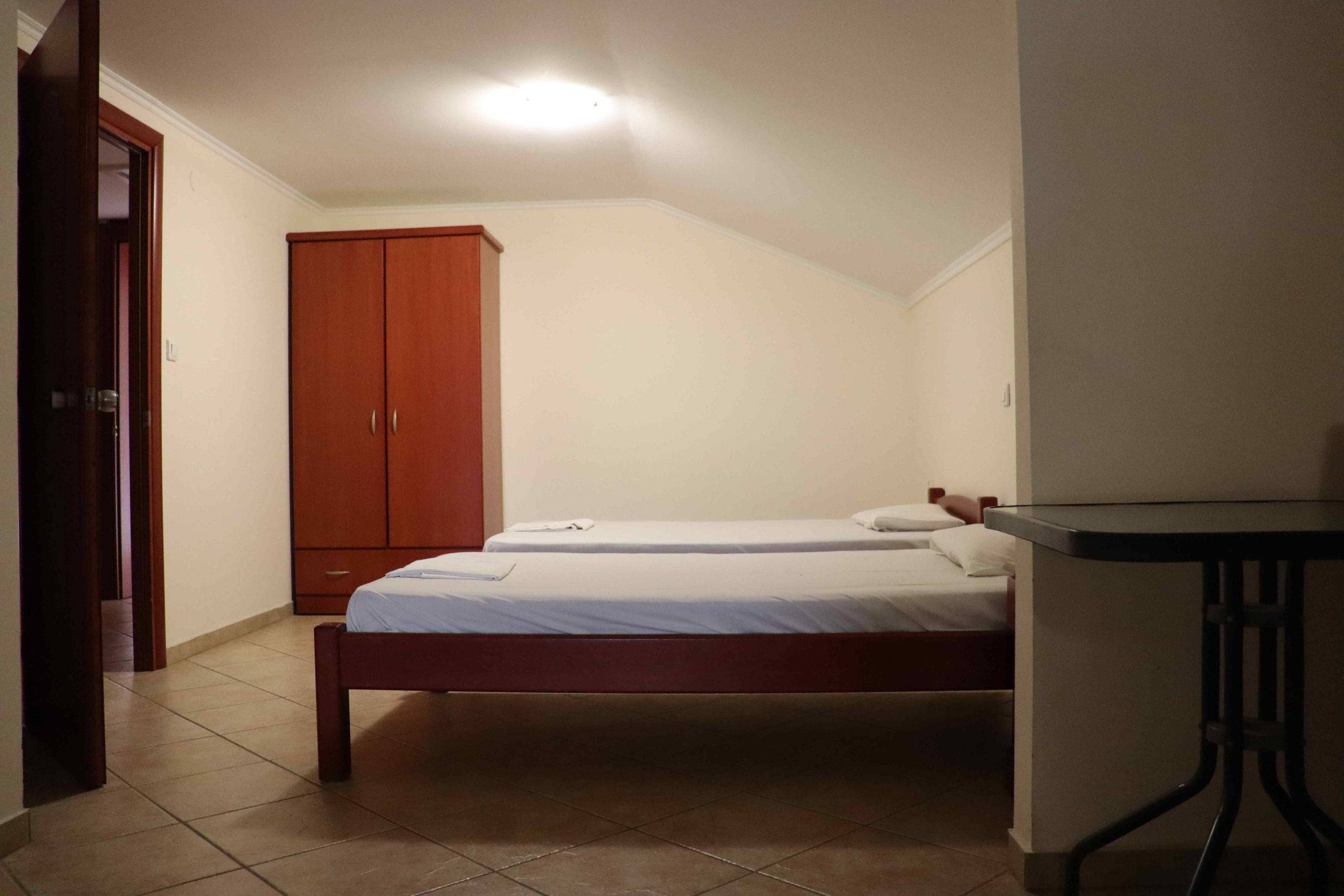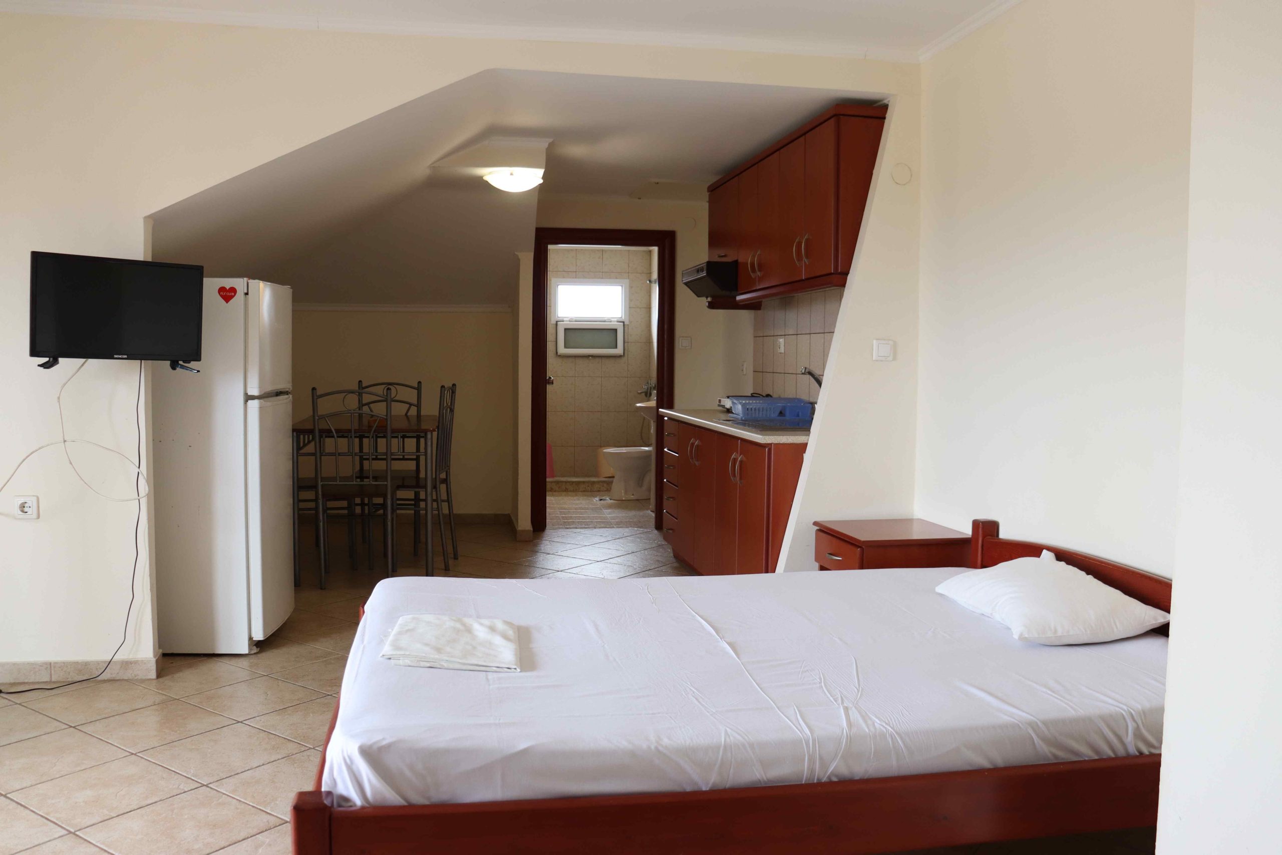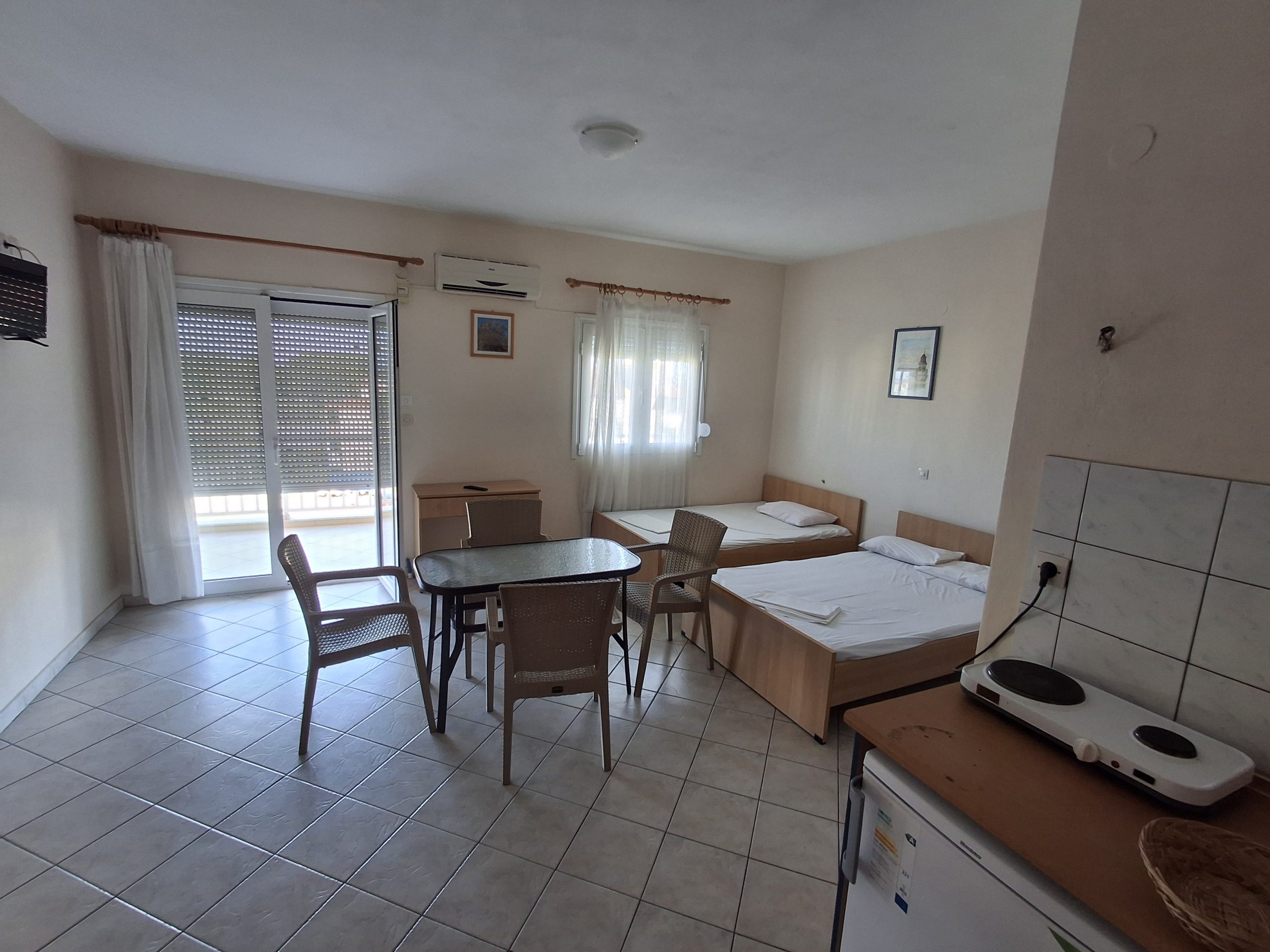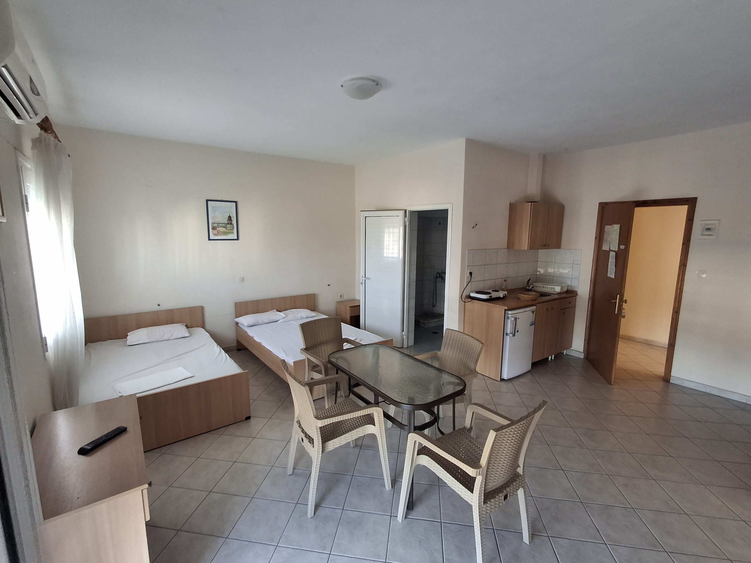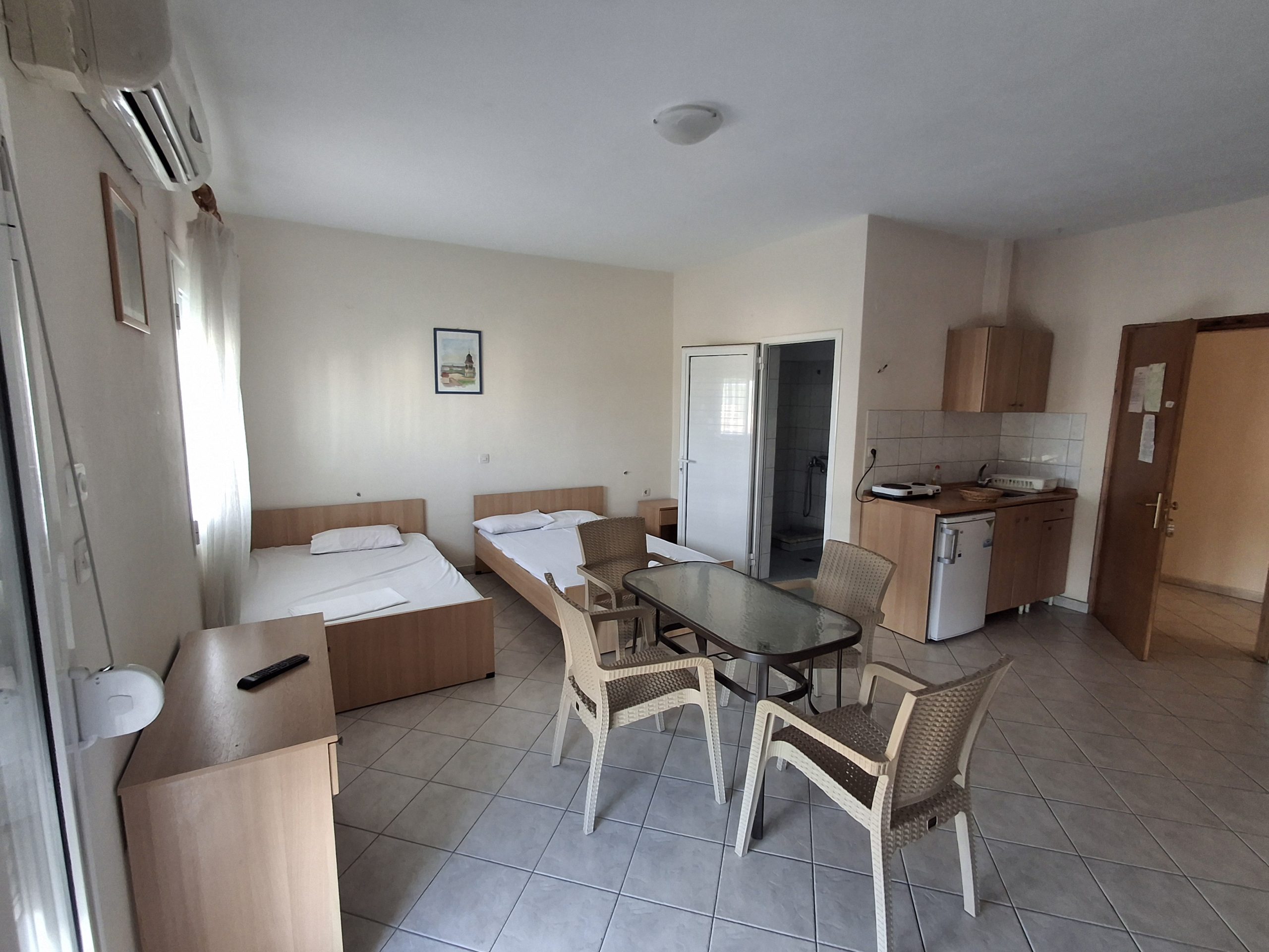- Sadržaji: Prostrane smeštajne jedinice (25-35 m²) standardno i funkcionalno su opremljene, poseduju TV i klima uređaje. Terase na uličnoj strani pružaju pogled ka solunskom zalivu, dok su one na zapadnoj strani orijentisane prema Olimpu i imaju tende . U objektu nema peškira.