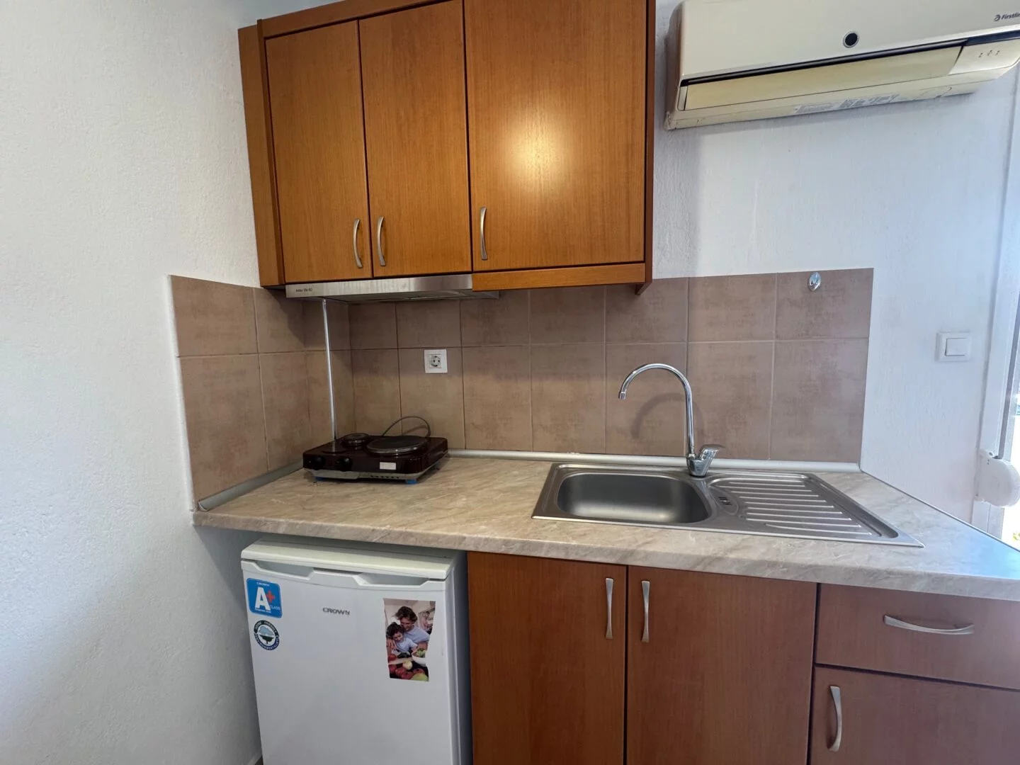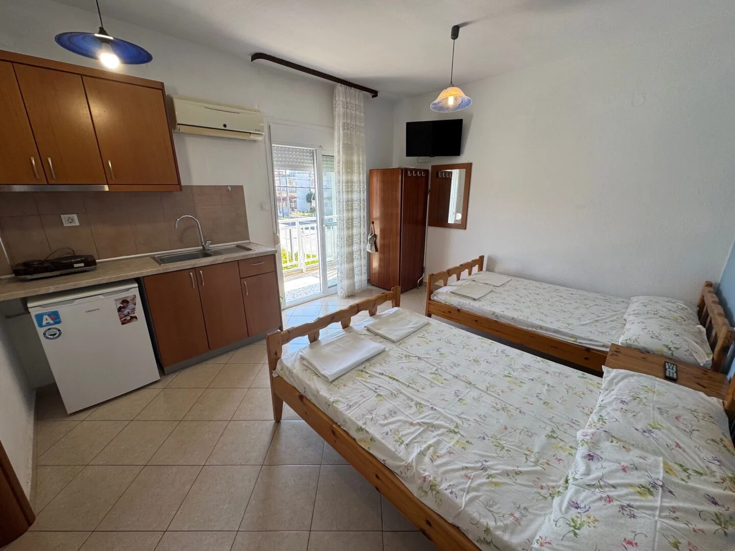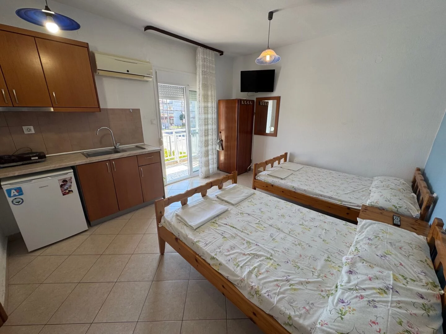 - Studiji i apartmani imaju opremljenu kuhinju i sopstveno kupatilo. Korišćenje klime je moguće uz doplatu (5€ dnevno).