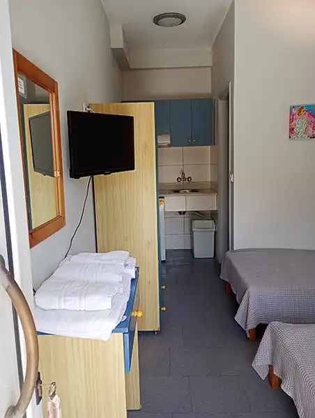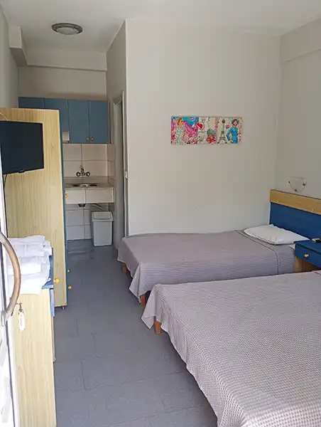 Mere kreveta u Grčkoj se razlikuju od naših standarda. Grčki standard za normalan-singl krevet je širine od 75 – 90 cm, a za francuski krevet (za 2 osobe) širine od 110 – 140 cm. - Ulazak u smeštaj je u 12.00h po Grčkom vremenu prvog dana boravka, a izlazak iz smeštaja je u 08.00h po Grčkom vremenu poslednjeg dana boravka. Obezbeđen je prostor za prtljag I wc za goste, za prvi i poslednji dan boravka.