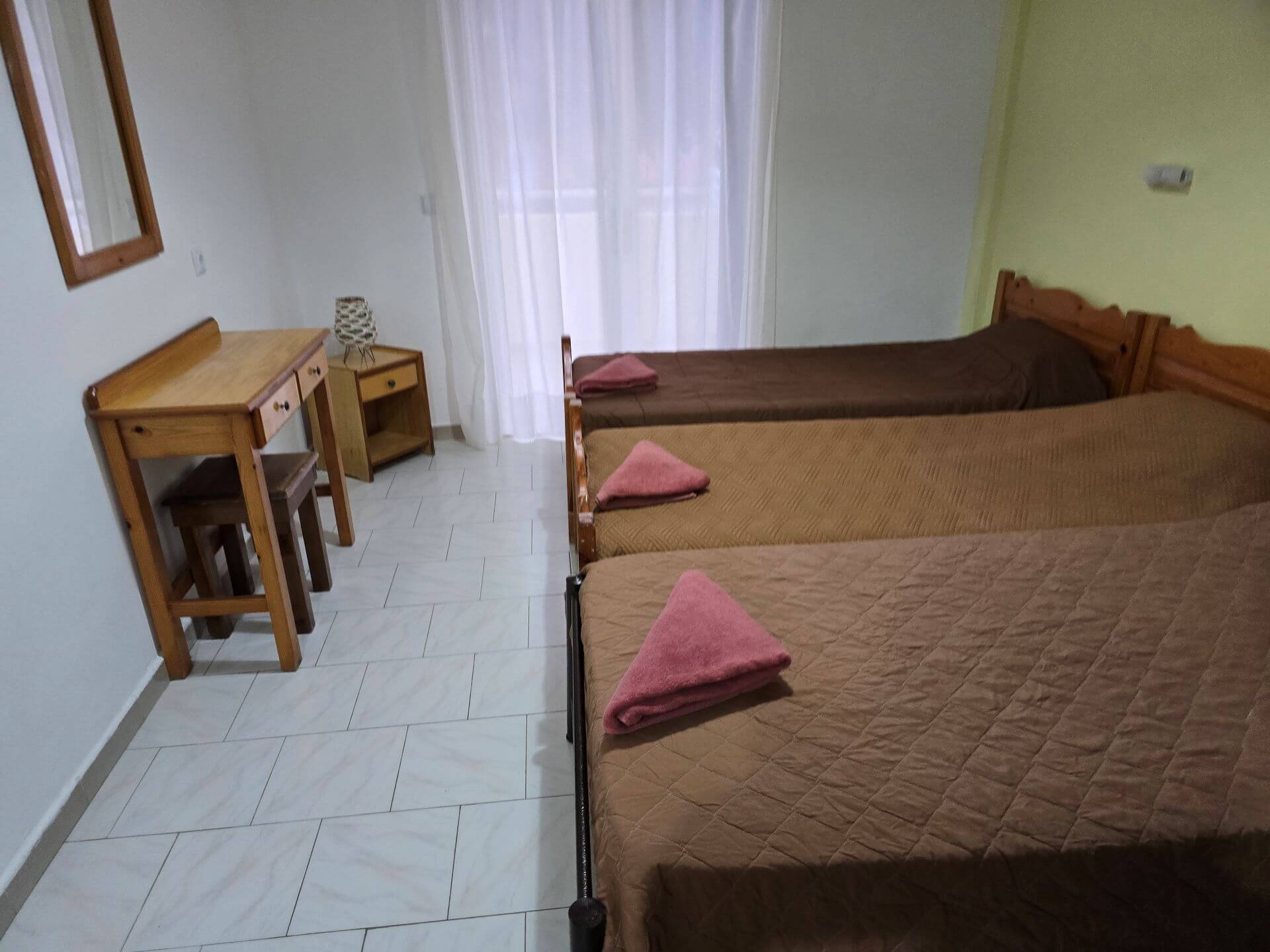 - Dimenzije ležaja u Grčkoj se razlikuju od naših standarda (ležaj/krevet je dužine 185 – 190 cm, a širine, standardno 75 – 90 cm i francuski-bračni 120 – 140 cm). Broj osoba iz cenovnika ne znači i broj kreveta u studiu/apartmanu, već mogućnost da se smesti taj broj osoba, bilo u standardnim bilo u bračnim krevetima. Treći ležaj u sobi u hotelu Andreas je kvalitetna sofa, na razvlačenje.