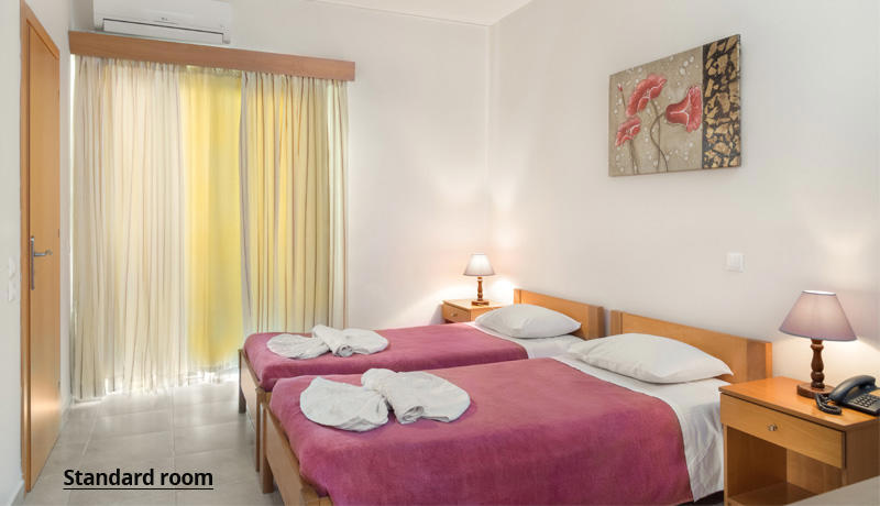 Hotel raspolaže sa 42 smeštajne jedinice. Sve sobe sadrže klima uređaj (uz doplatu 5 evra dnevno), SatTV, telefon, Wi-fi internet besplatno, mini frižider, sef (besplatno), kupatilo, balkon ili terasu. U ponudi su standardne sobe koje sadrže francuski ili dva odvojena ležaja i primaju maksimalno dve osobe. - Usluga: